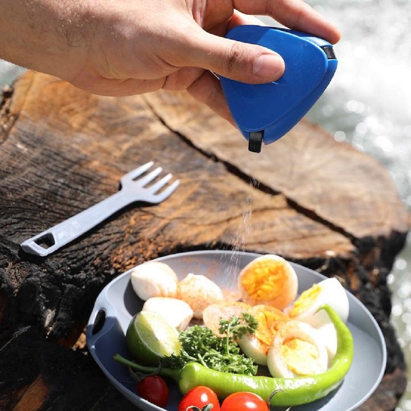 ادویه‌پاش کم‌حجم و سبک با سه مخزن مجزا برای نمک، فلفل و ادویه، ساخته‌شده از پلاستیک مقاوم و بهداشتی؛ مناسب برای سفر، کوهنوردی و کمپینگ.