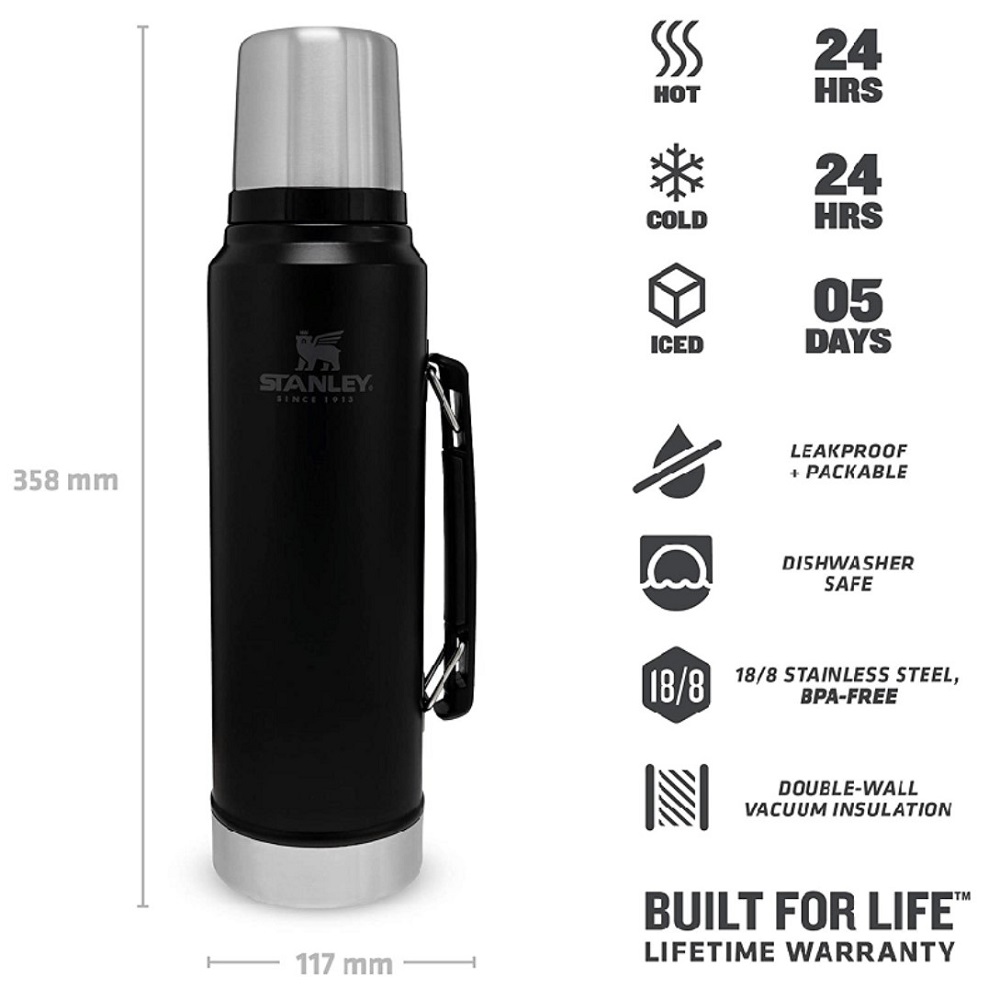 فلاسک استنلی کلاسیک با ظرفیت ۱ لیتر، ترکیبی از سبک طراحی کلاسیک و مقاومت بیهمتاست. این فلاسک از استیل ضدزنگ 18/8 بدون BPA ساخته شده و با عایق خلأ دو جداره خود، قابلیت نگهداری نوشیدنی را تا 24 ساعت گرم، 24 ساعت سرد و یخ تا 5 روز دارد. درب آن عایقشده است و بهعنوان فنجان کاربردی استفاده میشود. طراحی ضدنشت، ساختار مقاوم، و قابلیت شستوشو در ماشین ظرفشویی، آن را به گزینهای ایدهآل برای سفر، کمپینگ یا استفاده روزمره تبدیل میکند.