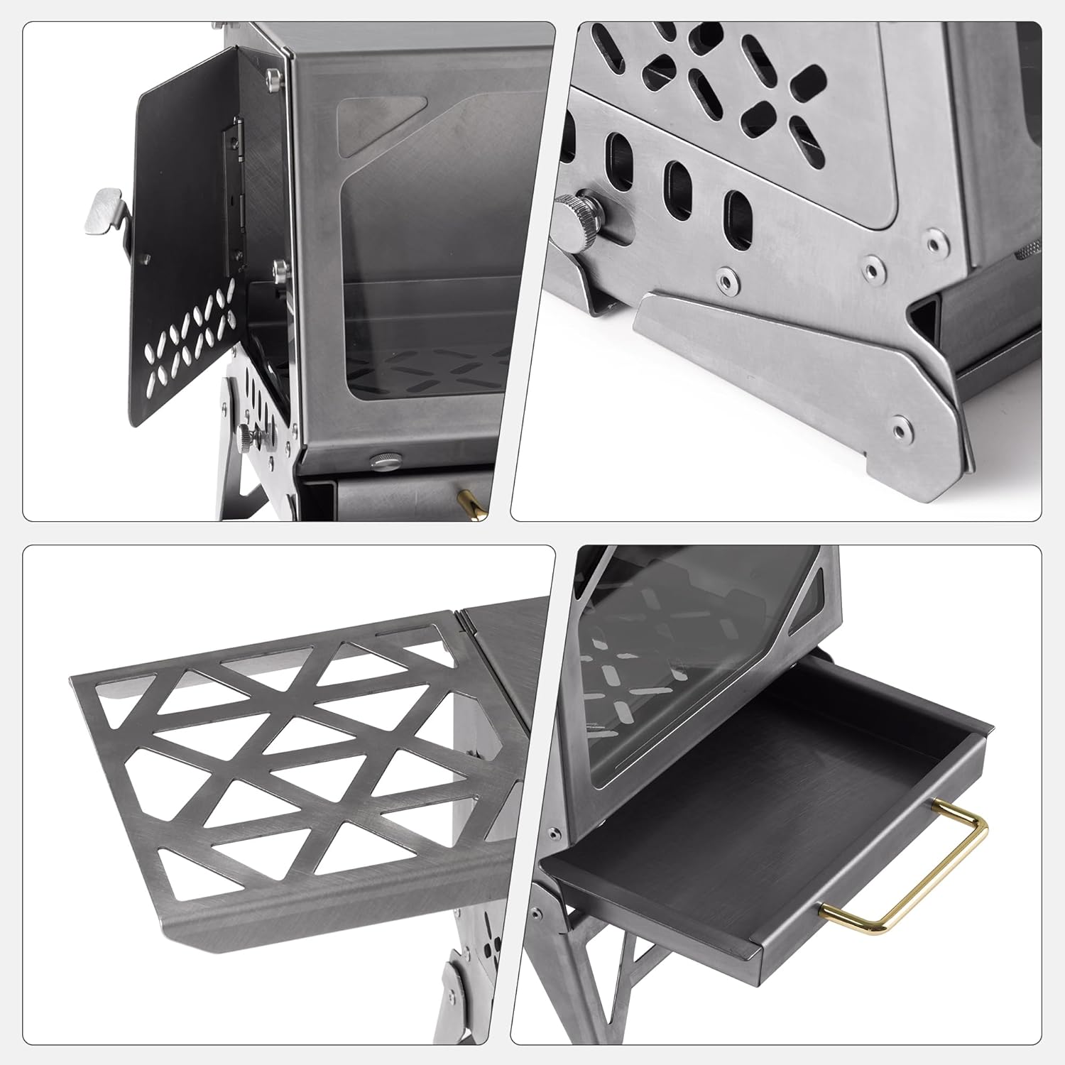 این اجاق قابلیت استفاده از هیزم بهعنوان سوخت را داشته و دارای دریچههای تهویه قابل تنظیم است تا عملکرد حرارتی بهینه و پخش یکنواخت گرما فراهم شود. همچنین طرحی مستحکم و پایدار با پایههای محکم دارد و سطحی برای قرار دادن لوازم جانبی تعبیه شده است.