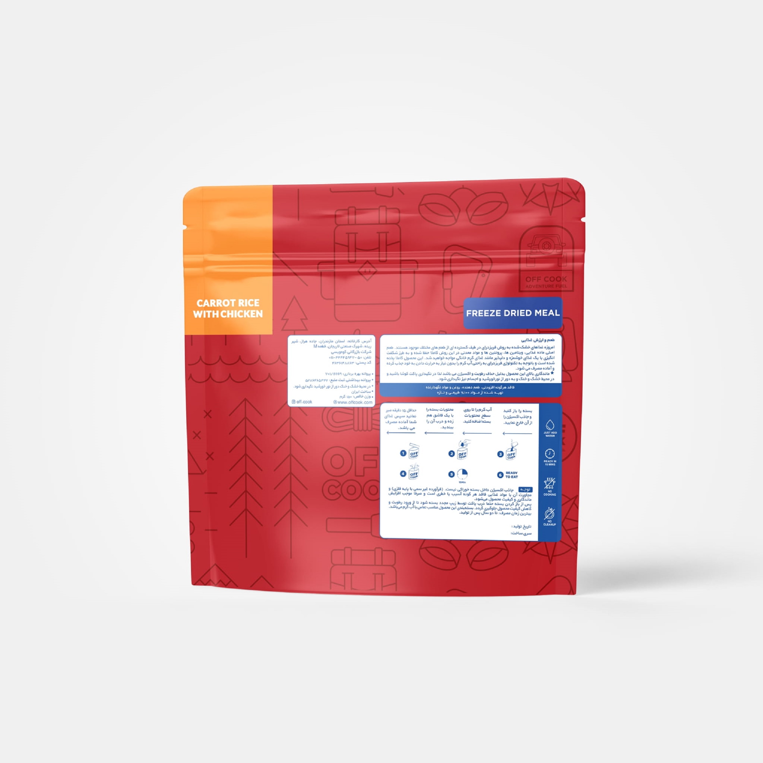 آفکوک هویج پلو با مرغ یک وعده غذایی کامل و سالم است که از برنج ایرانی، مرغ تازه، کشمش، هویج و ادویه مخصوص تهیه شده است. این غذا با استفاده از فناوری خشککردن انجمادی (Freeze-Dry) فرآوری شده و برخلاف غذاهای دهیدراته که با جریان هوای گرم خشک میشوند، ارزش غذایی و طعم اصلی خود را به بهترین شکل حفظ کرده است.