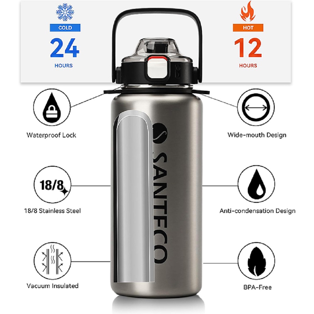 فلاسک ورزشی سانتکو 1200 میلی لیتری مدل ERIE گزینهای عالی برای کسانی است که در طول روز مصرف زیادی آب دارند یا موقع ورزش، کار و فعالیتهای بیرونی باید آب فراوان همراه داشته باشند. ظرفیت ۱۲۰۰ میلیلیتر باعث میشود نیازی به شارژ مکرر نداشته باشید و بتوانید آب یا نوشیدنی سرد یا داغ را برای مدت بیشتری همراه خود داشته باشید.